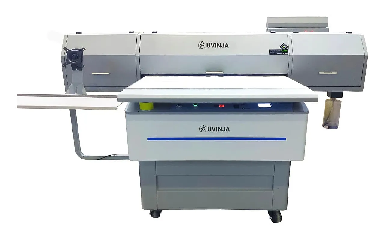 Планшетный UV принтер UVinja 9060 — экономичное решение для производства сувенирной продукции, POS-материалов, упаковки и оформления интерьеров. Он работает на трех печатных головах Epson I3200-U1 и обладает областью печати 90×60 см. В базовой комплектации печатные головы принтера расположены в три ряда, что позволяет в рамках одного задания наносить сразу три слоя: белую подложку, цветное изображение, а также полное или выборочное лаковое покрытие.