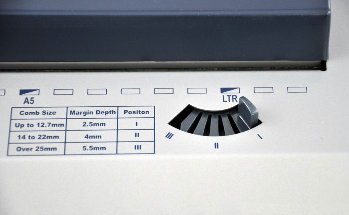 | Дополнительные характеристики | определитель размера пружины; пробивает А3, В4 - 24 отверстия, А4 - 21 отверстие, А5; 3 режима контроля отступа от края листа до пробиваемых отверстий; отключение всех ножей; специальный фиксатор для сохранения шага пробиваемых отверстий; специальная разборная ручка для перфорации формата А3; две рукоятки для одновременной перфорации и брошюровки. |