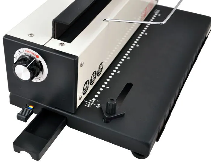 | Дополнительные характеристики | шаг 3:1, пробивает круглые отверстия 34 шт. х d=4 мм, фиксатор для выравнивания страниц документа, 3 режима (5, 7, 9 мм) отступа от края листа до центра, регулировка уровня диаметра зажима пружины. |