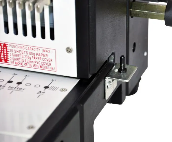| сохранения шага пробиваемых отверстий), отключение всех ножей, 3 режима (5, 7, 8 мм) контроля отступа от края листа, до центра пробиваемых отверстий, регулировка уровня диаметра зажима пружины, длина переплета машиной - 340 мм |