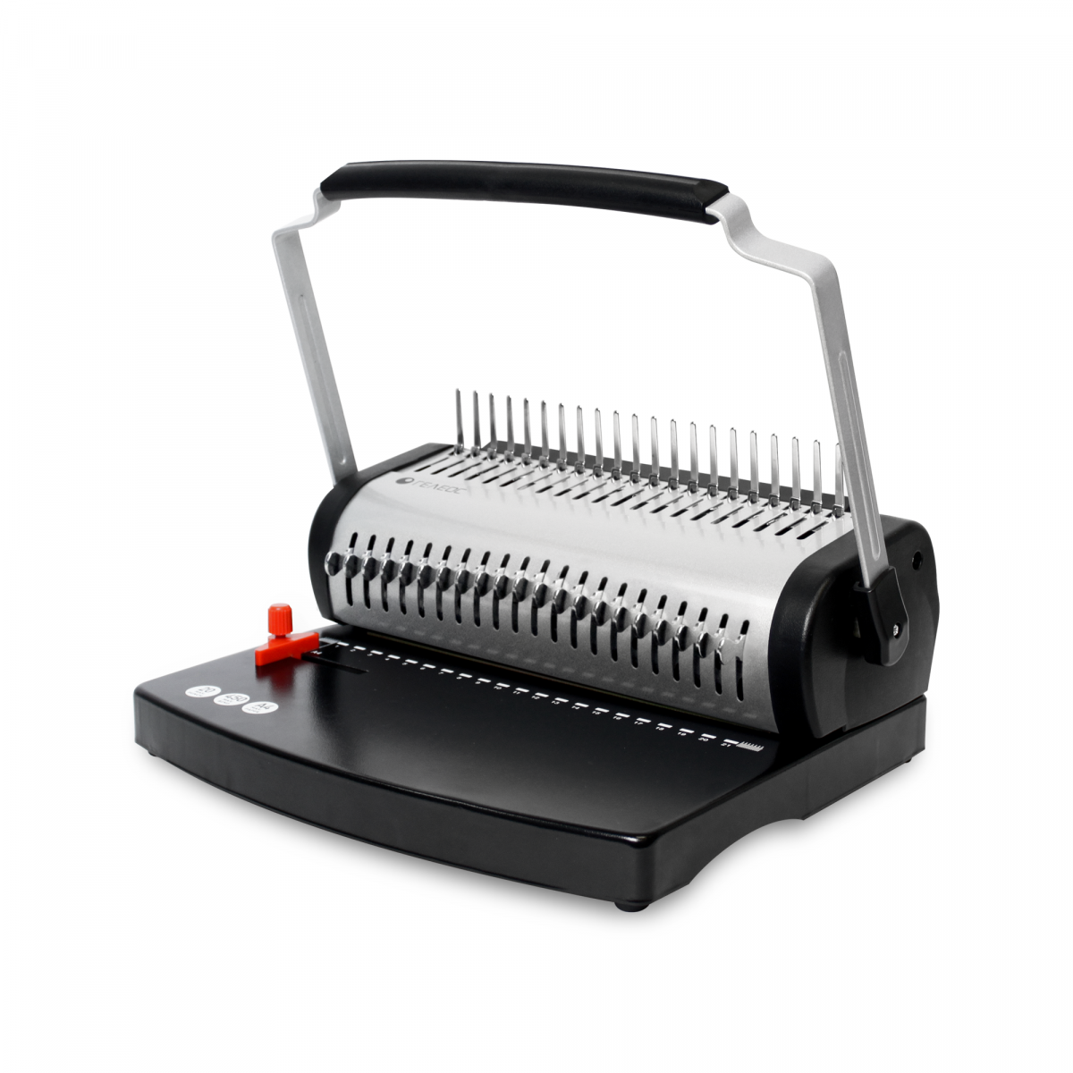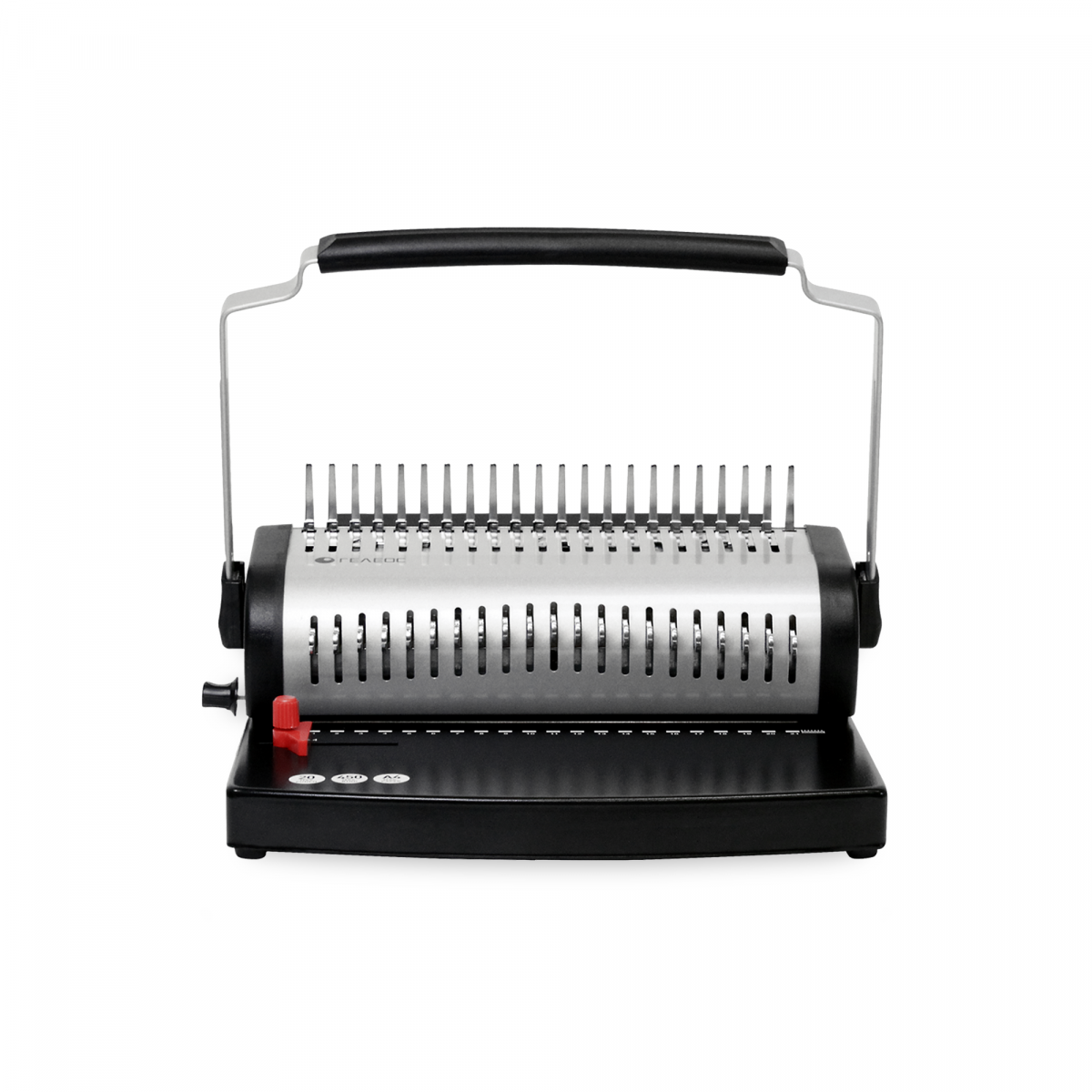 Брошюровщик ГЕЛЕОС БП-500-2 имеющий металлический корпус. Удобная П-образная ручка облегчает перфорацию за счет усиленного приложения рычажной силы. Есть отключающийся ножи перфорации, для работы с нестандартными форматами. Для более удобной работы с большими объемами переплетаемых документов (свыше 300-т страниц) рекомендовано осуществлять разжим пластиковой пружины не до конца.