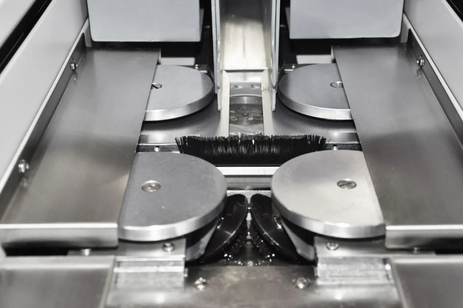 - Термоклей тщательно наносится на корешок системой из трех роликов;