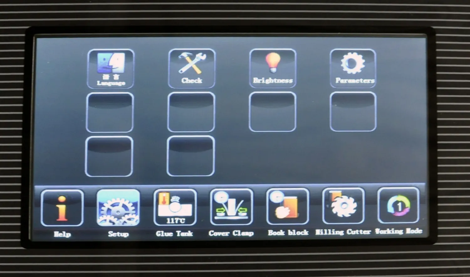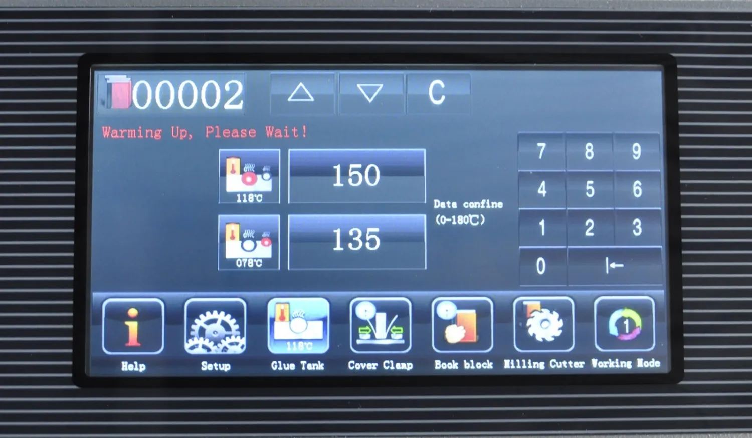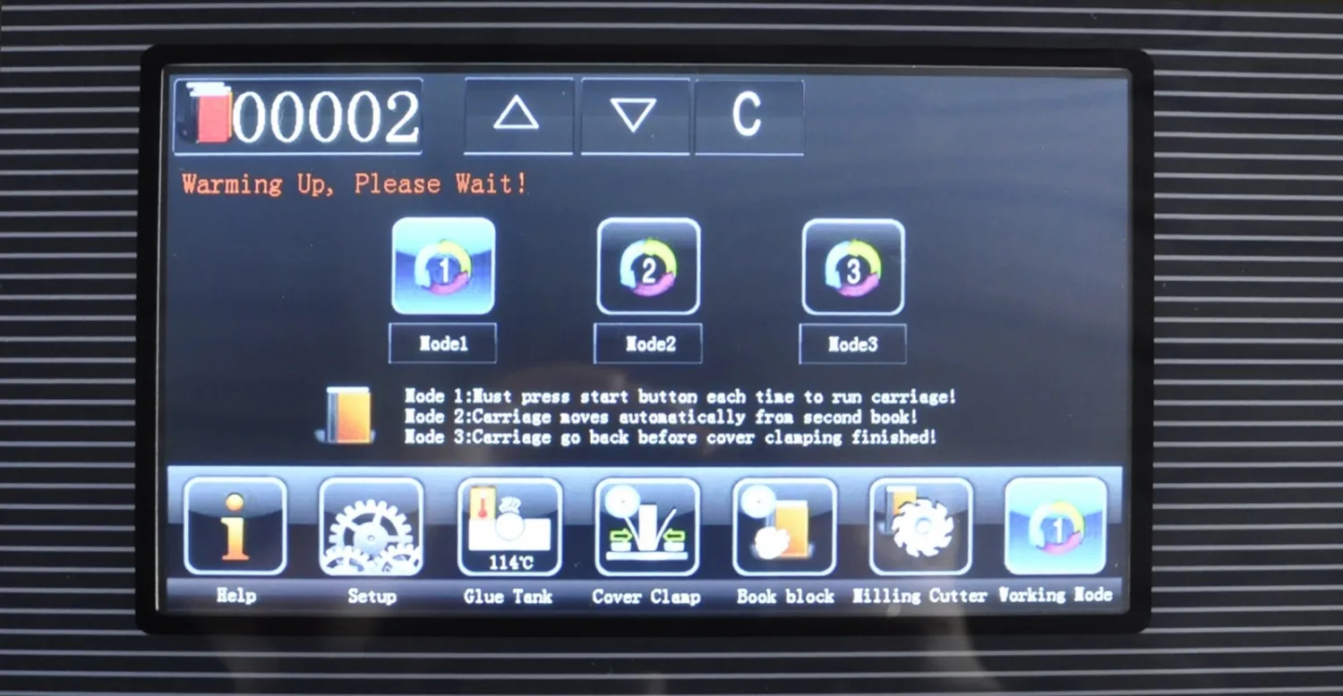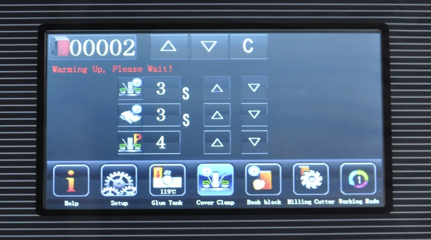 | Дополнительные характеристики | боковая проклейка двумя дополнительными роликами, фрезерование 0.0-2.0 мм, (фреза 9 зубцов, 9 торшонирующе-фрезеровальных ножей), вал удаления излишков клея подогреваемый, автоматический обжим обложки, регулировка усилия прижима обложки, регулировка неравномерности прижима обложки, линейное перемещение станции зажима книги, полноцветный сенсорный LCD дисплей, мешок для сбора бумажной стружки, рабочий стол для обложек. |