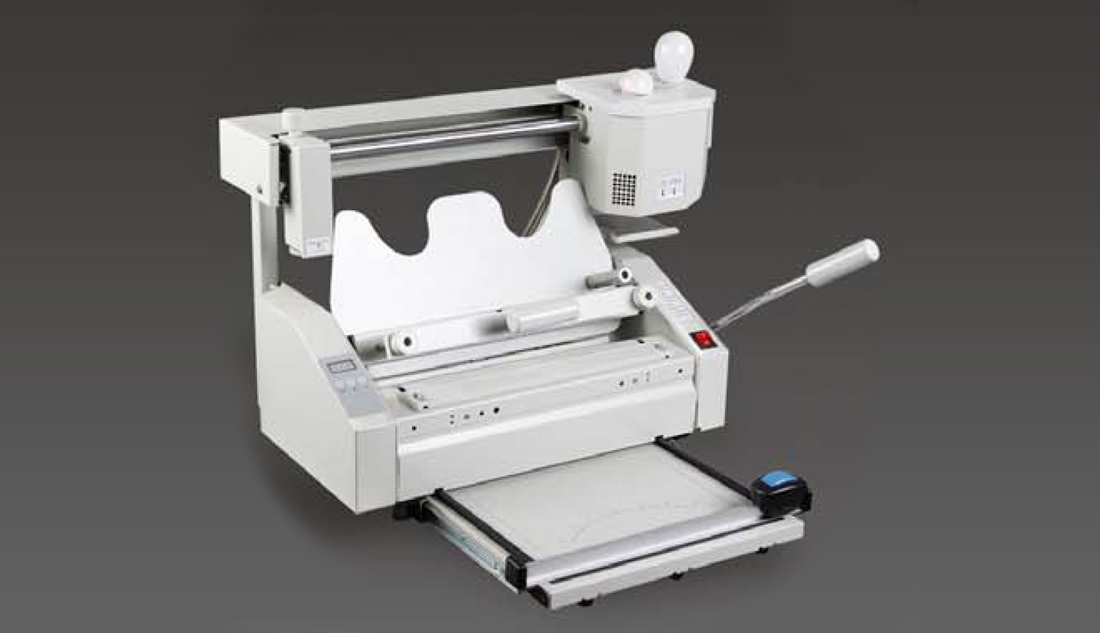 Оснащается термостатом клеевого расплава с настраиваемой температурой, фрезой для торшонирования корешка, обжимным прессом и роликовым механизмом с возможностью быстрой, силами оператора, установки отрезного, бигующего или перфорирующего ножа для изготовления обложек.