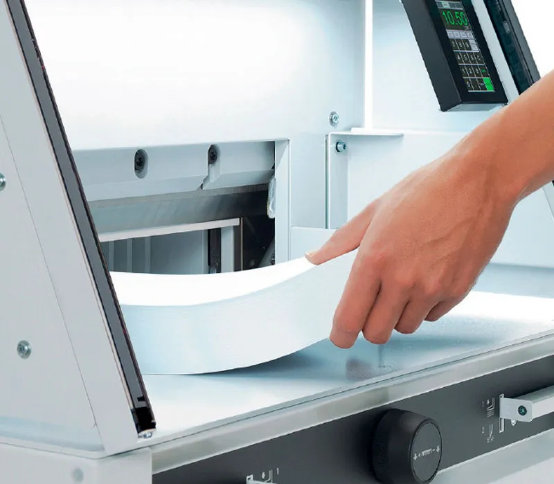 Оптический индикатор линии реза с яркими, расчитанными на долгий срок службы светодиодами гарантирует легкое выравнивание стопы по меткам реза. Нож гильотины, сделан из высококачественной немецкой стали. Две боковые направляющие для бумаги расположены на переднем и заднем столе.