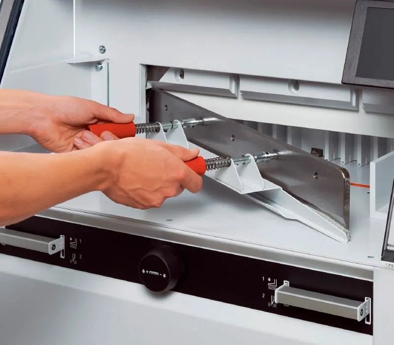 Замена ножа производится без применения инструментов, что делает процедуру максимально простой и минимизирует время простоя резака. Компания IDEAL подчёркивает, что все компоненты устройства на 100% производятся в Германии, включая высококачественные лезвия из инструментальной стали.