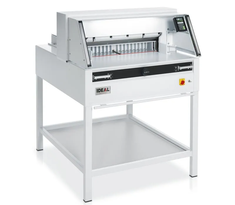 Максимальная длина реза IDEAL 6660 составляет 650 мм; модель оснащена оптической индикацией линии реза на основе ярких светодиодов. Машина оснащены сенсорным пультом управления с цифровым дисплеем, позволяющим запрограммировать привод затла с точностью до 0,1 мм/0,01 дюйма.