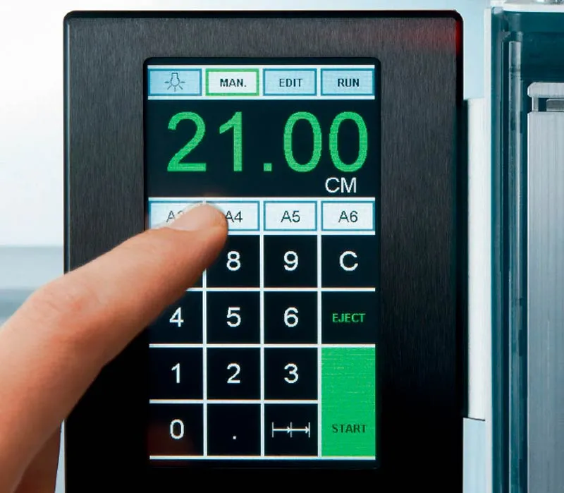 IDEAL 6660 оснащен сенсорным программируемым пультом управления с цифровым дисплеем. Дисплей отображает длину реза в сантиметрах или в дюймах с точностью до 0,1 мм/0,01 дюйма. Блок управления позволяет сохранять до 99 программ с 99 позициями реза в каждой. До 15 повторяющихся резов могут быть интегрированы в качестве одного шага программы. Программа запускается автоматически.