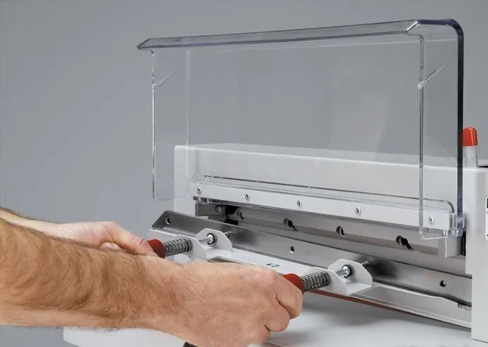 К практичным и безопасным функциям гильотины Ideal 4305 добавились такие особенности как: более легкая замена ножа и быстрая замена марзана через боковую стойку корпуса. Кроме того, немного изменилась конфигурация защитного прозрачного кожуха, что позволяет резать стопу без ограничения по глубине.
