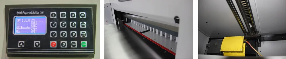 Профессиональный гильотинный резак с программным управлением Bulros 7208H может использоваться для резки бумаги в копировальных, издательских центрах и типографиях. Аппарат позволяет резать одновременно до 800 листов бумаги (плотность 70 г/м2), ширина реза составляет 720 мм. Выравнивание стопы бумаги до линии реза на рабочей поверхности резака Bulros 7208H производится при помощи затла (упора). Перемещение затла производится автоматически с помощью электрического привода. Для ввода координат реза предусмотрена цифровая клавиатура. Положение затла отображается на LCD дисплее с точностью 0,1 мм. Для перемещения упора в модели Bulros professional series 7208H используется червячный редуктор с плавным ходом и низким уровнем шума. Минимальное расстояние от ножа до затла составляет 45 мм. Гильотинный резак оснащен программируемым пультом управления с памятью на 97 программ, по 8 позиций резов на запрограммированном расстоянии.