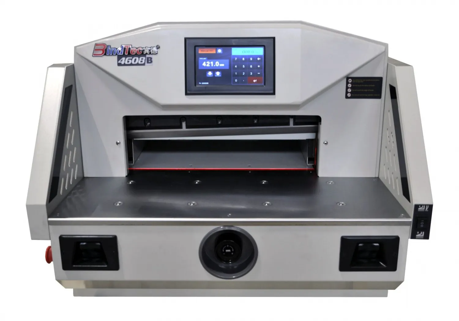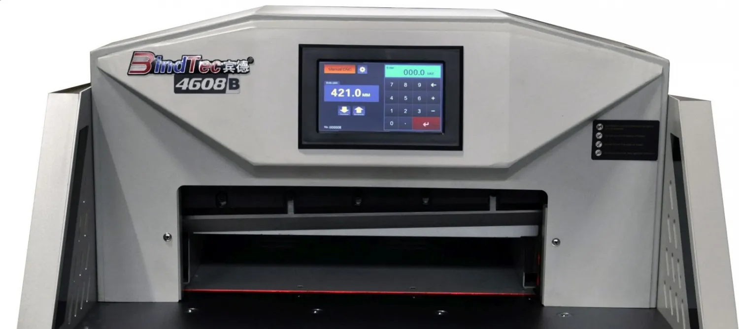 BindTec 4608B – гильотина с механическим приводом лезвия (электромотор + редуктор) и полноцветным сенсорным LCD для удобства настройки и программирования.