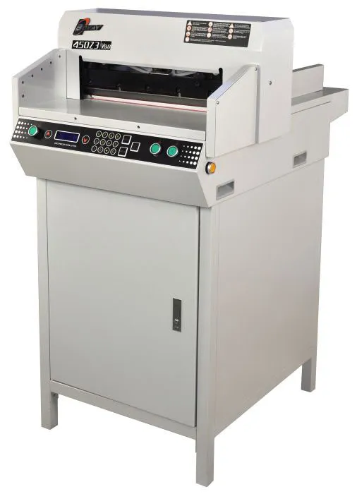 BW-450Z3 - очень удачная модель гильотины с механическим приводом лезвия (электромотор + редуктор). Прижим бумаги с электроприводом и регулировкой усилия. Возможность автоматической выдачи бумаги после реза. Чаще используется как основная в небольших типографиях, или как вспомогательная для подрезки уже готовой продукции. Модель имеет все необходимые современный системы блокировки для защиты рук оператора.