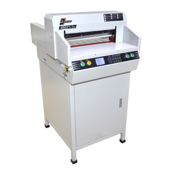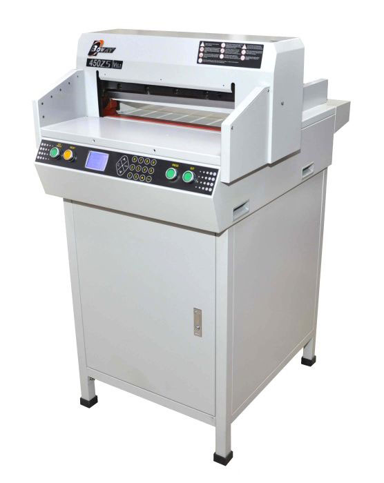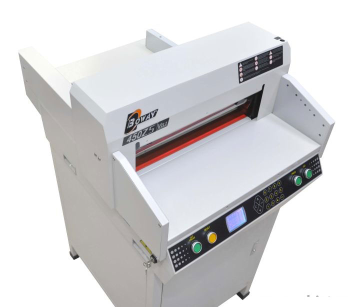 BW-450Z5 - дальнейшее развитие очень удачной модели гильотины с механическим приводом лезвия 450Z3 (электромотор + редуктор) в которую добавлена возможность программирования. Прижим бумаги с электроприводом и регулировкой усилия. Возможность автоматической выдачи бумаги после реза. Топовая гильотина в 450 серии, может использоваться как основная в небольших типографиях, или как вспомогательная для подрезки уже готовой продукции. Модель имеет все необходимые современные системы блокировки для защиты рук оператора.