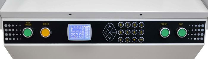 | Дополнительные характеристики | цельнометаллическая рама, точность позиционирования 0,3 мм, электрический привод затла, инфракрасная защита от попадания посторонних предметов в рабочую зону реза, регулировка силы прижима - 9 уровней, независимая система прижима и реза, возможность автоматической выдачи бумаги после реза. |