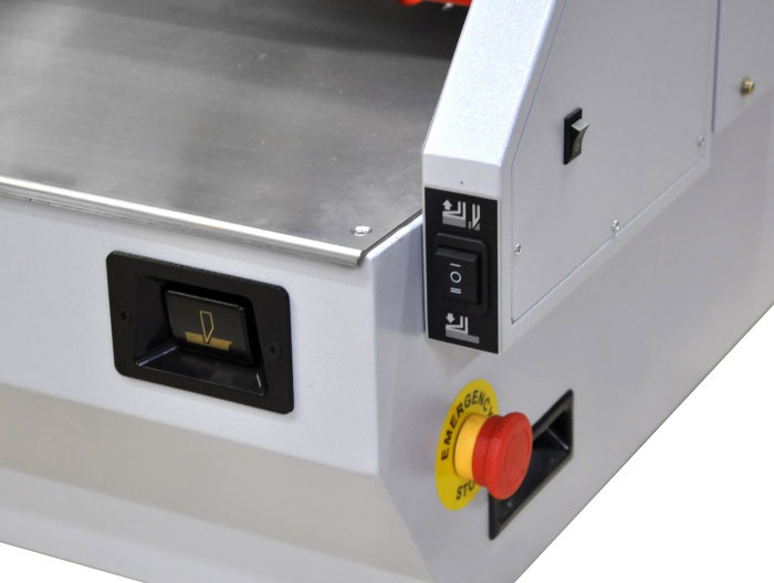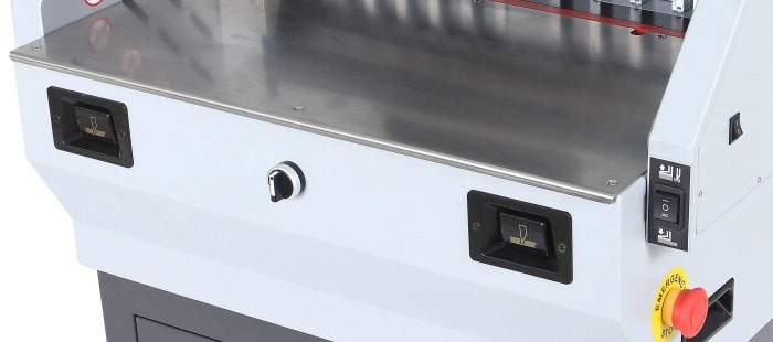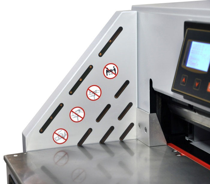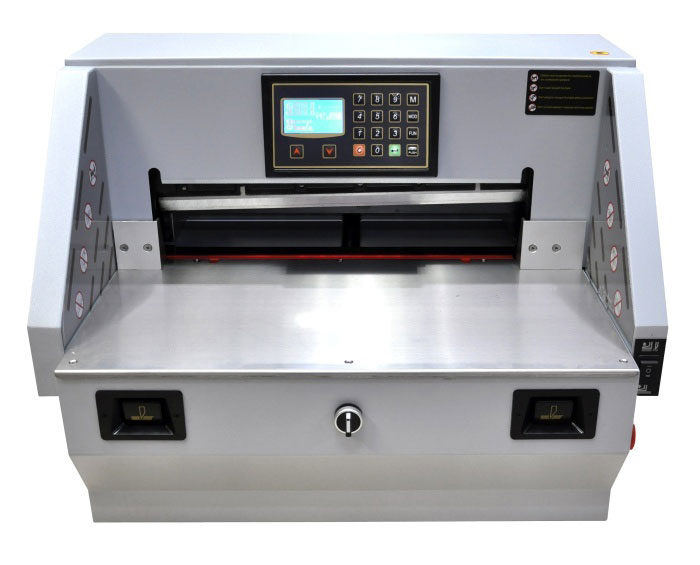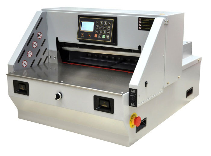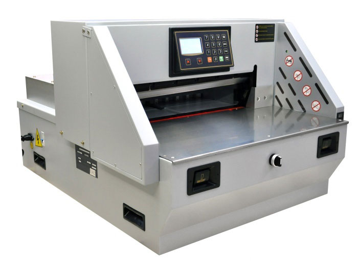 Гильотина оснащена прижимом бумаги с электроприводом и LCD дисплеем, а