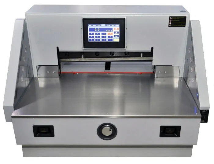 | Дополнительные характеристики | цельнометаллическая рама, точность позиционирования 0,3 мм, электрический привод затла, инфракрасная защита от попадания посторонних предметов в рабочую зону реза, регулировка силы прижима - нет, независимая система прижима и реза, полноцветный сенсорный LCD дисплей, возможность автоматической выдачи бумаги после реза, при максимальной стопе возможно отключить нижний ряд ИК датчиков. |