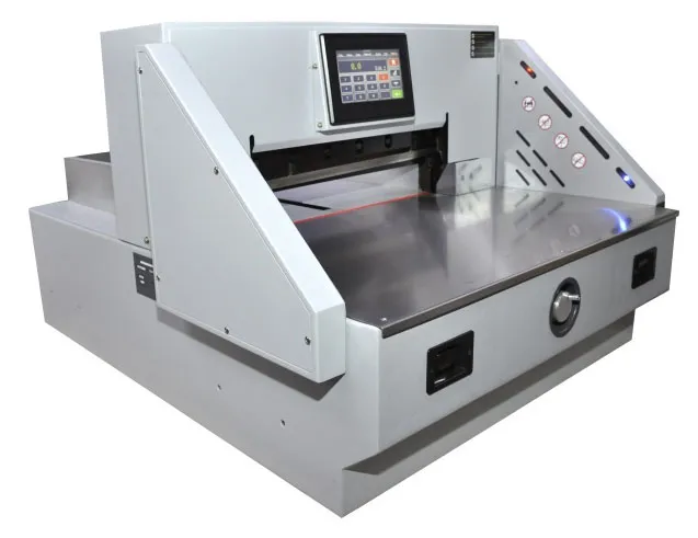 Гильотина оснащена прижимом бумаги с электроприводом и полноцветным сенсорным