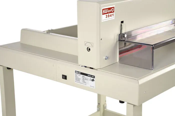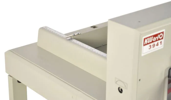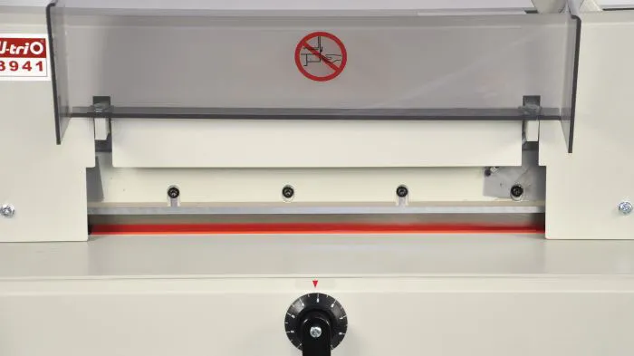 KW-triO 3941 имеет подсветку линии реза, а зажим стопы производится с помощью специальной ручки - быстродействующего прижима, создавающего давление на стопу, что позволяет сделать качественный рез стопы бумаги высотой до 55 мм форматов до А3 по длинной стороне и A2 по узкой стороне. Длина реза составляет 430 мм. При открытом защитном экране из ударопрочного ABS пластика со специальной системой блокировки ножа, нож удерживается в безопасном верхнем положении.