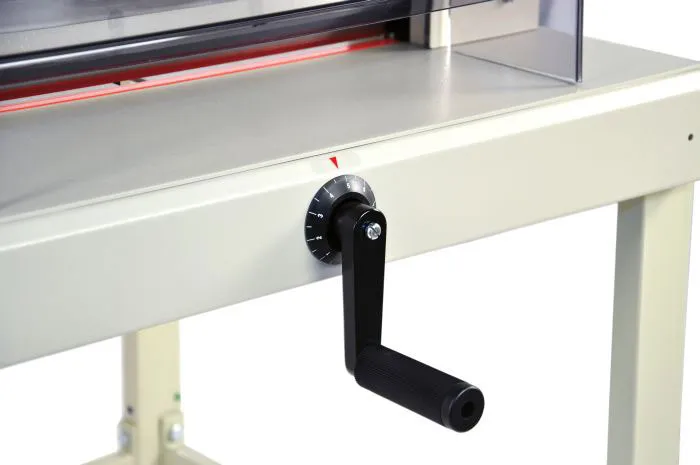 В комплектацию гильотины входит стол-подставка, марзан, нож из закаленной стали. Рукоятка перемещения затла, расположенная на передней панели, позволяет добиться точности реза до 0,5 мм.