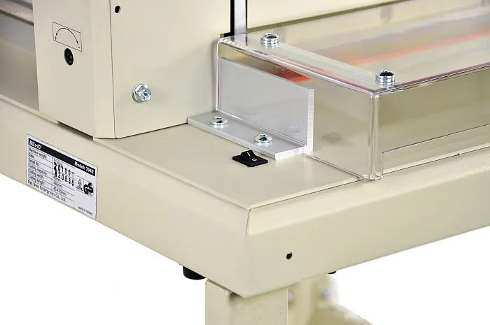 Имеет подсветку линии реза, а зажим стопы производится с помощью специальной ручки - быстродействующего прижима, создающего давление на стопу, что позволяет сделать качественный рез стопы бумаги до 40 мм (400 листов) форматов до А3 по длинной стороне и A2 по узкой стороне. При открытом защитном экране из ударопрочного ABS пластика со специальной системой блокировки ножа, нож удерживается в безопасном верхнем положении.