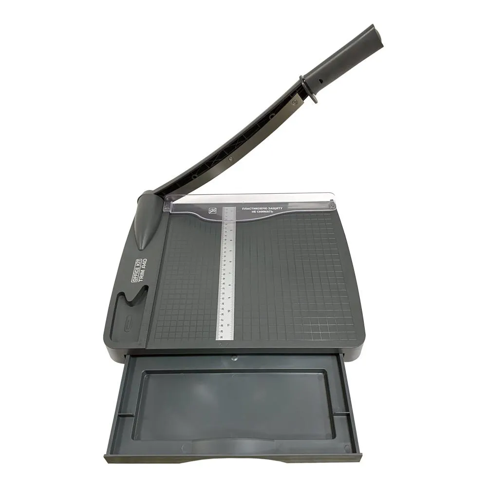 Сабельный резак для домашнего и офисного применения для бумаги формата А4. Рабочий стол оснащен удобным встроенным органайзером для хранения канцелярских мелочей. Контрнож позволяет одновременно разрезать до 16 бумажных листов. Съемная рукоятка надежно фиксируется и препятствует соскальзыванию руки. Сабельный нож сделан из качественного металла. Это позволит быстро и точно разрезать необходимую продукцию.