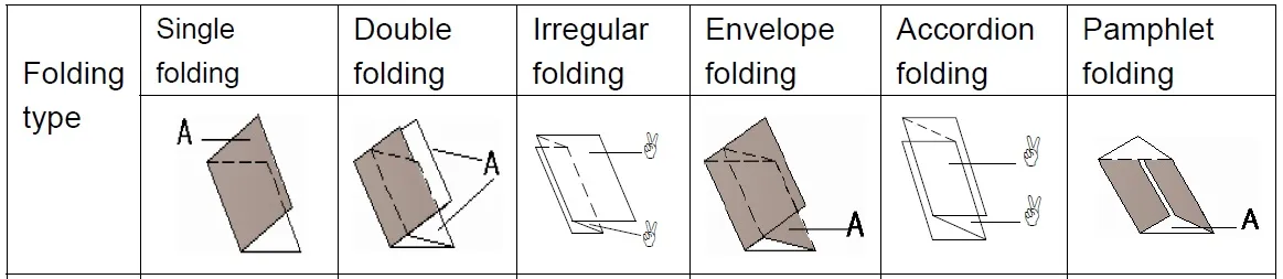 | Вид фальца | Один фальц, двойной фальц, неравные фальцы, складывающаяся фальцовка, фальцовка гармошкой, фальцовка вида «каталог» |