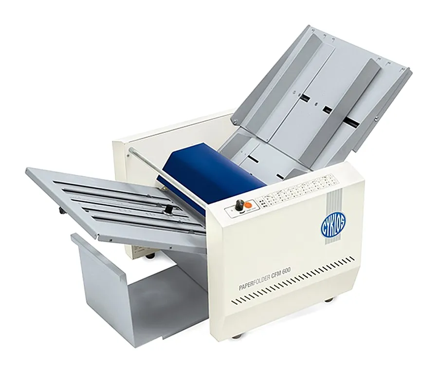 CYKLOS CFM 600 — настольный офисный фрикционный фальцаппарат, кассетного типа. Машина компактна и проста в настройке, предназначена для точного и быстрого сгибания рекламных буклетов, писем, презентационных материалов и т.п. Она легко настраивается на один из шести стандартных видов фальца — брошюра, зигзаг, одинарное сложение пополам, двойное параллельное сложение, письмом, полузигзаг.