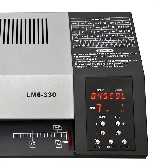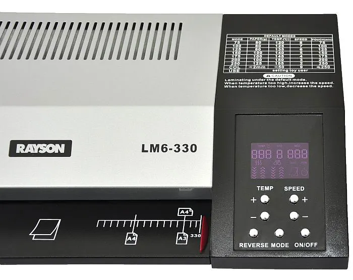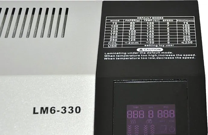 | Дополнительные характеристики | микропроцессорная система управления, цифровой дисплей, 8 предустановленных настроек ламинирования + одна пользовательская настройка, толщина ламинирования до 2,0 мм, реверс, возможно фольгирование, время непрерывной работы до 4-х часов, автоотключение после 30 мин простоя, вентиляторы охлаждения, мощность 1000 Вт. |