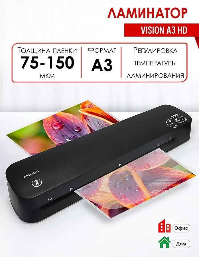 Vision A3 HD — отличная модель недорогого пакетного ламинатора формата А3, в которой инженеры собрали самые необходимые характеристики для качественного ламинирования и сделали ламинатор максимально удобным для пользователя. В ламинаторе есть регулировка температуры для работы с пленками толщиной 75/100, 125 и 150 мкм. Добавлено сразу несколько технологий и опций: «Speedy Heat» — быстрый нагрев и готовность к работе за 1 минуту; сенсорная панель управления; индикация толщины пленки; автоматический переход ламинатора в дежурный режим через 30 минут работы. Все это собрано в стильном компактном и прочном корпусе из высококачественного пластика.