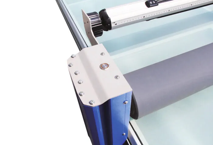 Вал на портале подвешивается на двух независимых направляющих и имеет по одному пневмоцилиндру с каждой стороны, что обеспечивает ему безукоризненную точность в горизонтальной плоскости, жесткую фиксацию в требуемом положении, отсутствие малейших люфтов и гарантирует равномерное давление по всей длине вала. Портал оснащен держателем для рулона с пленкой.