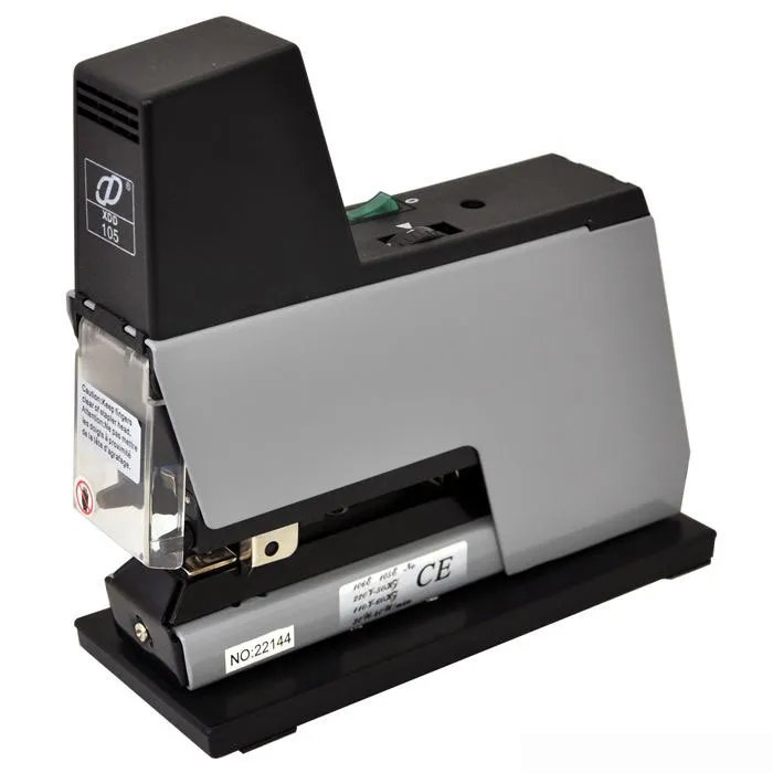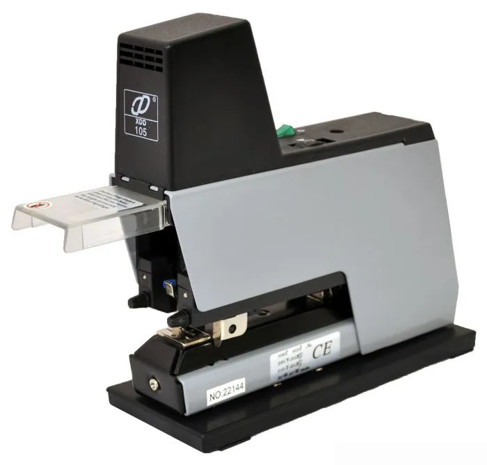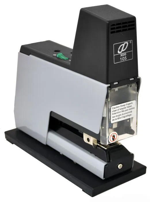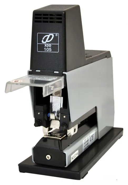 Профессиональный электрический степлер XDD-105, скрепляет листы металлической скобой (66/6,66/8) втачку (скрепление по краю). Может применяться, как в делопроизводстве, так и в типографиях.