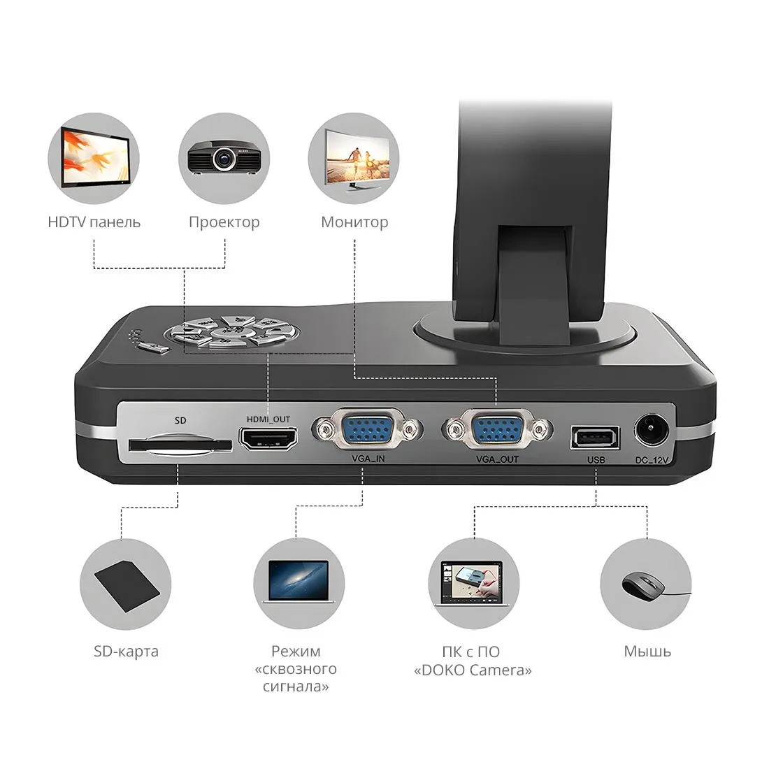 DC4M – универсальная документ-камера, сочетающая компактный дизайн и «серьезные» функциональные возможности. Наличие цифровых и аналоговых видеовыходов позволяет использовать камеру в учебных классах, переговорных комнатах и конференц-залах.