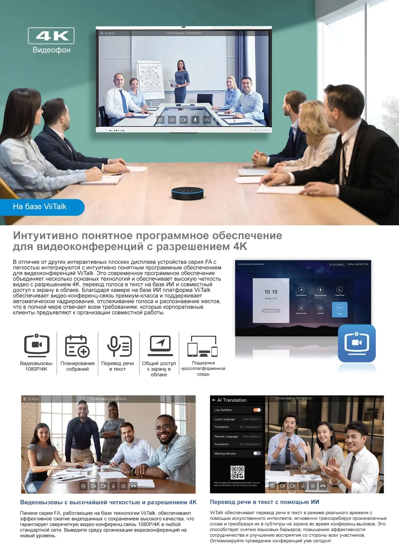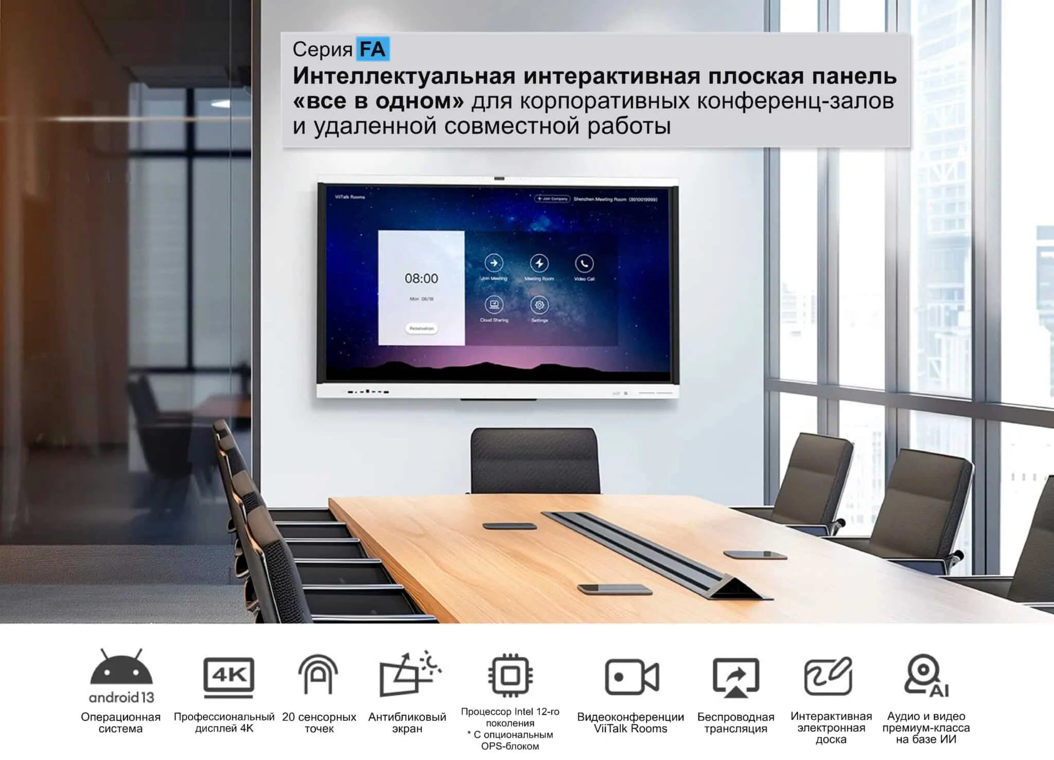 Панель серии FA — это инновационный, многофункциональный интерактивный плоский дисплей, разработанный для бесшовной адаптации к различным помещениям для встреч. Это интеллектуальное решение объединяет мощную систему видеоконференций на базе ViiTalk, оснащенную камерой с искусственным интеллектом, кристально чистыми динамиками и массивом из нескольких микрофонов с технологиями отслеживания голоса и шумоподавления. Эта панель для совместной работы, доступная в трех размерах (65, 75 и 86 дюймов), работает на новейшей версии Android 13 и предлагает широкий спектр настраиваемых опций. Она обеспечивает захватывающий опыт проведения встреч, облегчая корпоративное сотрудничество в любое время и в любом месте.