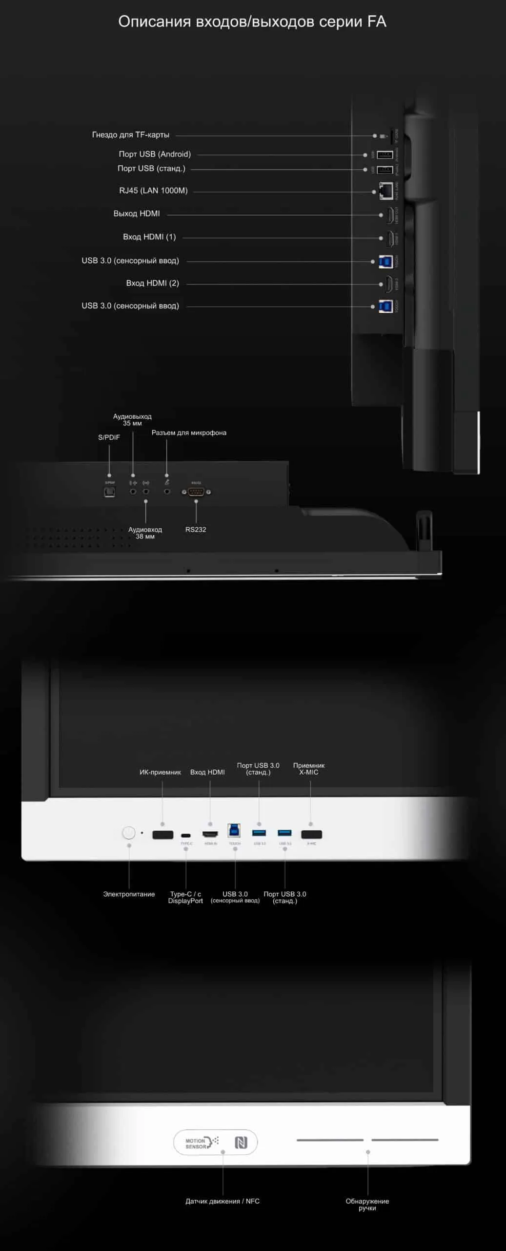 | Передняя панель (ввод/вывод) | HDMI In x 1, USB-B (Touch) x 1, USB-A 3.0 ((Dynamic) x 2, USB-C x 1, IR Receiver x 1, Wireless Mic.Receiver*¹ x 1 |