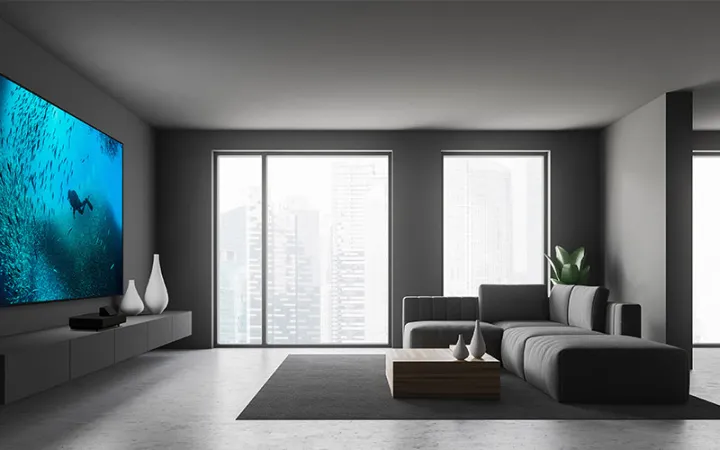 - Сверхкороткое расстояние проекции: экран 90 дюймов всего с 20 см