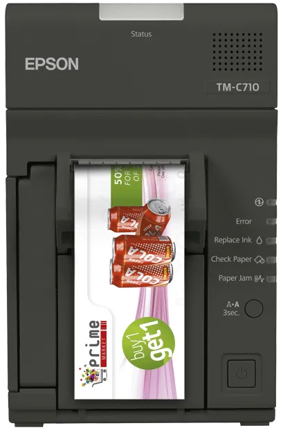 Компактный цветной принтер Epson TM-C710 для печати эффектных промо-купонов при проведении маркетинговых кампаний в точке продажи. Скорость печати 130 мм/сек., печать штрих-кодов, ширина рулонной бумаги 58 мм, интерфейс USB, Ethernet.