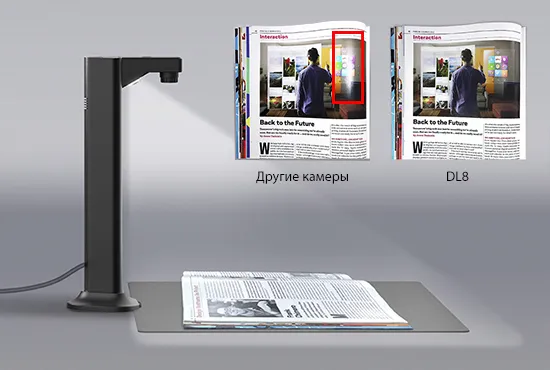 Мгновенное сканирование В отличие от других документ-камер, DL8 оснащена технологией кадрирования на рабочем столе, которая позволяет напрямую сканировать любые документы без дополнительного черного коврика для сканирования.