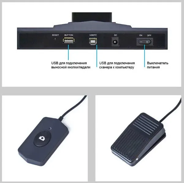 | Комплектация | Сканер, выносная USB-кнопка, ножная USB-педаль, мат, USB кабель, комплект напальчников, адаптер питания, CD с ПО, руководство |