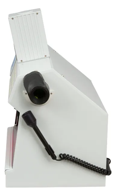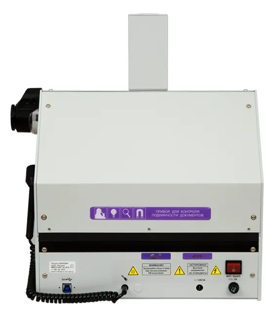 Имеет встроенный считыватель бесконтактных идентификационных микросхем, увеличенную рабочую зону над предметным столом с просветным экраном, прижимы для фиксации исследуемых документов, защитную шторку от вредного воздействия ультрафиолетового излучения.