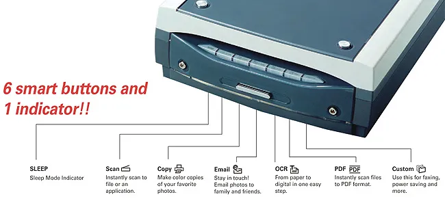 Эти клавиши на передней панели сканера дают возможность быстро и легко запускать часто используемые функции сканера. Достаточно нажать на кнопку - и соответствующая функция будет запущена. Шесть клавиш Smart-Touch включают Сканирование, Копирование, Отправку на электронную почту, Распознавание текста, Сканирование в PDF и Настраиваемую пользователем.