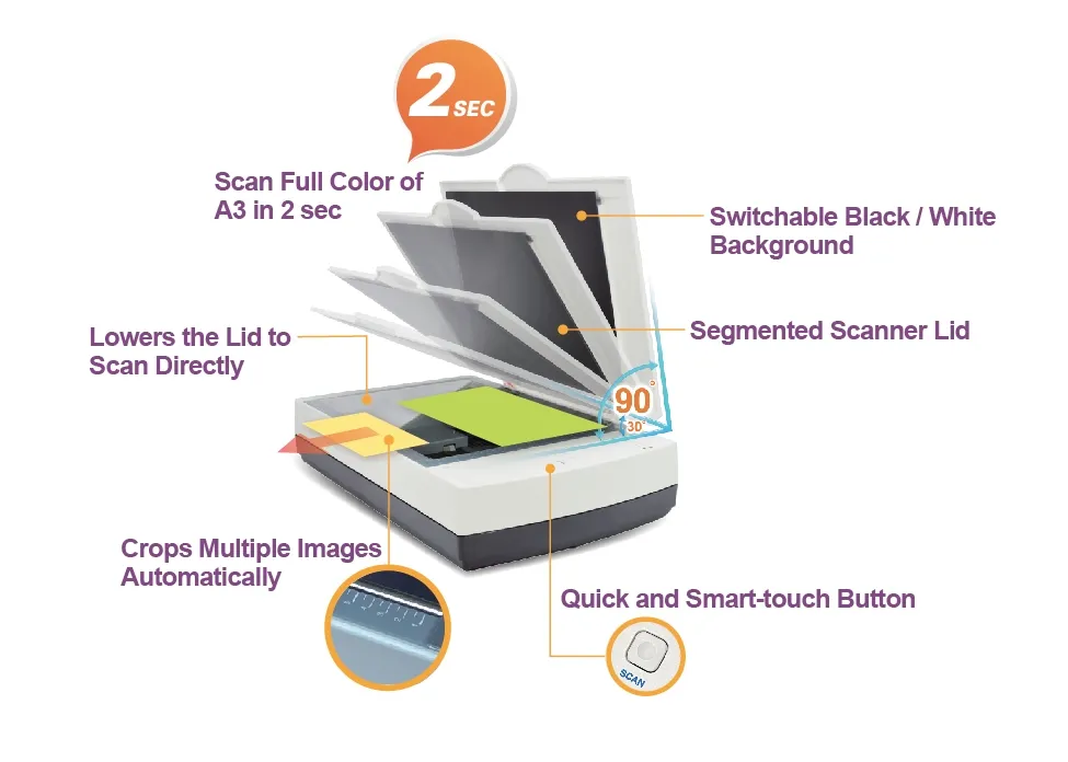Дизайн платформы без разрыва обеспечивает абсолютно плоскую поверхность сканирования. Следовательно, на негабаритом документе неостанется никаких следов, как только крышка закрыта. Кроме того, вам легко сдвинуть отсканированный документ из поверхности сканирования и позволяет проще положить книгу на поверхность сканирования, снижая вероятность получения размытых изображений, ближе к внутреннему краю книги.