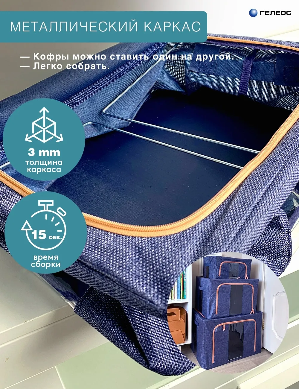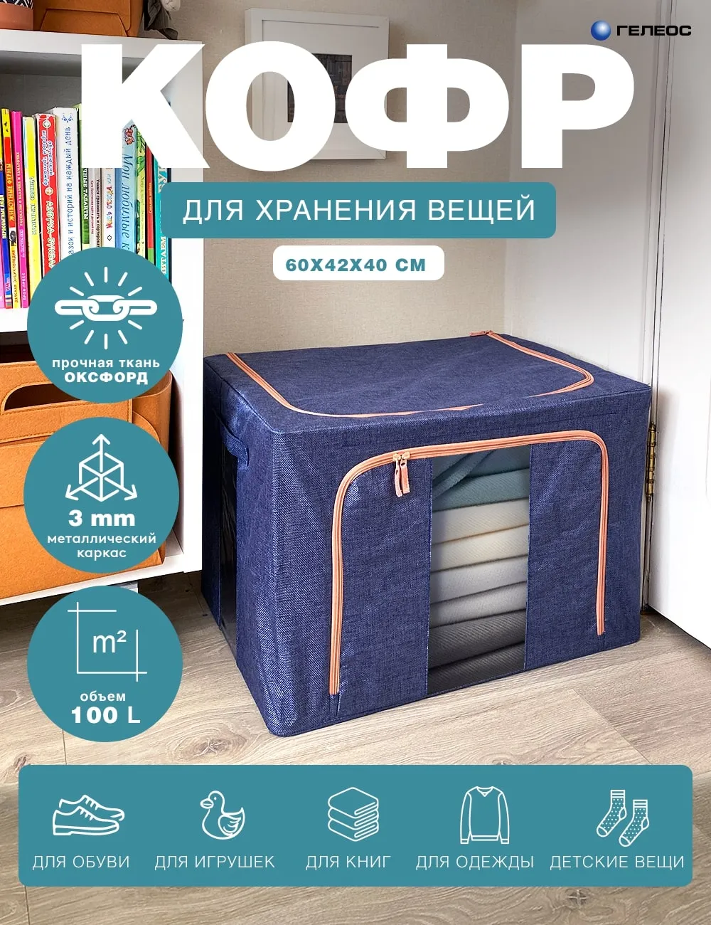 Складной кофр серии ГЕЛЕОС ОКСФОРД имеет металлический каркас и хорошо держит форму, решает задачи организации пространства и хранения вещей. Серия выполнена из ткани ОКСФОРД под рогожку крупного плетения, которая применяется при производстве сумок, одежды и обуви для экстремальных условий. Поэтому для кофров ГЕЛЕОС этой серии характерны высокая прочность, износостойкость, грязеустойчивость, водоотталкивание, термоустойчивость и простота ухода. Короба имеют прозрачные окошки для лёгкого поиска нужных вещей, молнии с двумя замками для быстрого доступа, а также надёжные ручки для перемещения. Удобные кармашки для подписи. Подходят для хранения сезонных вещей, белья, книг и других предметов обихода. Возможно использовать для хранения детских игрушек. Места расположения: прихожая, гостиная, детская, ванная, спальня, кладовая и игровая комнаты. Предназначены для шкафов, антресолей, полок, комодов, стеллажей.