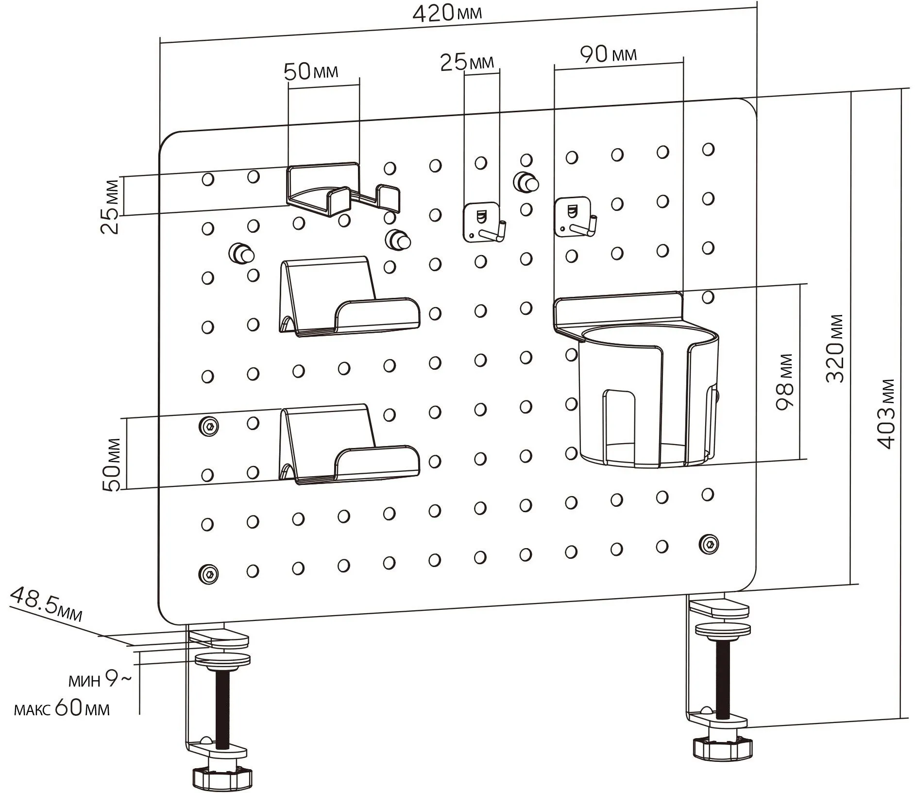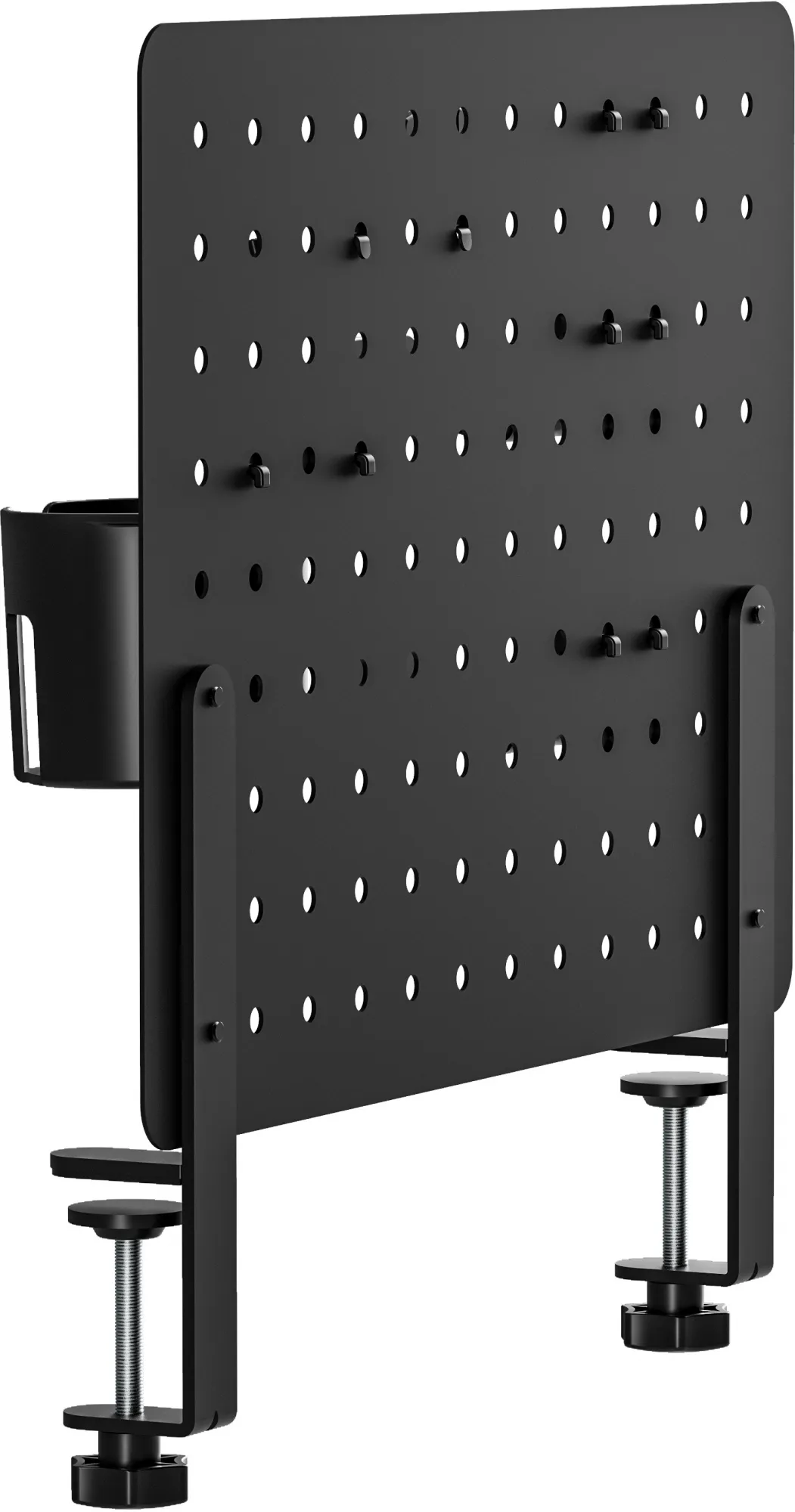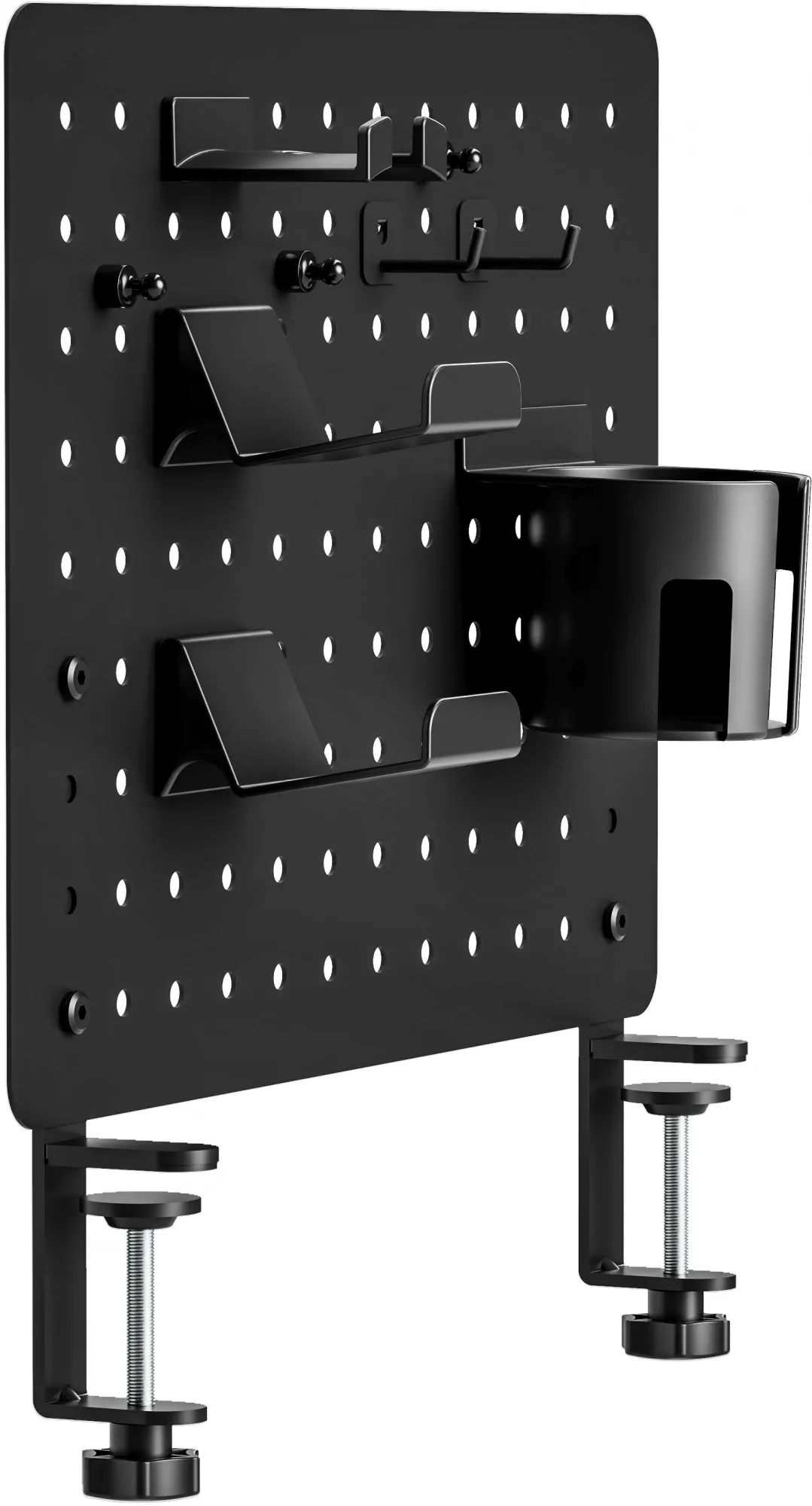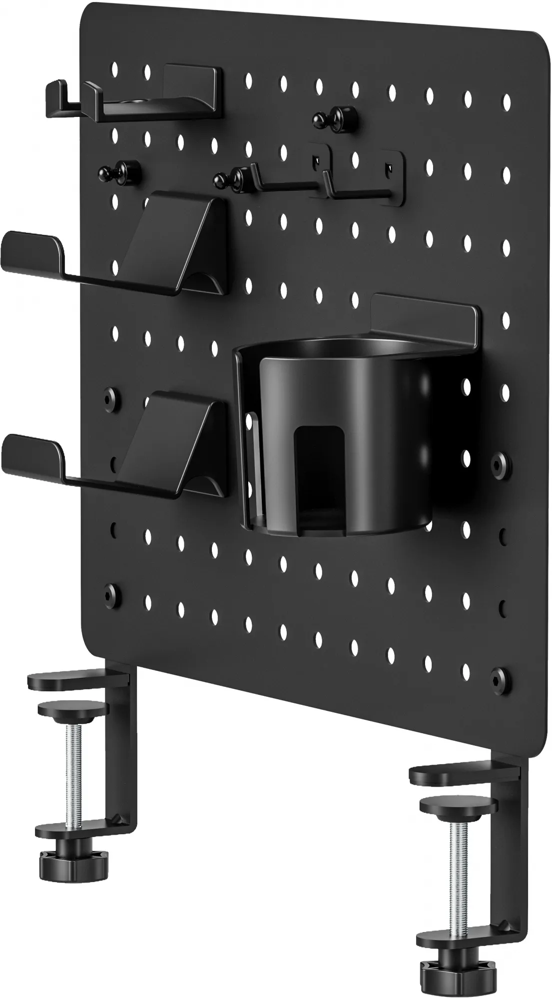 - Настольная перфорированная панель черного цвета с набором аксессуаров для организации рабочего пространства на столе