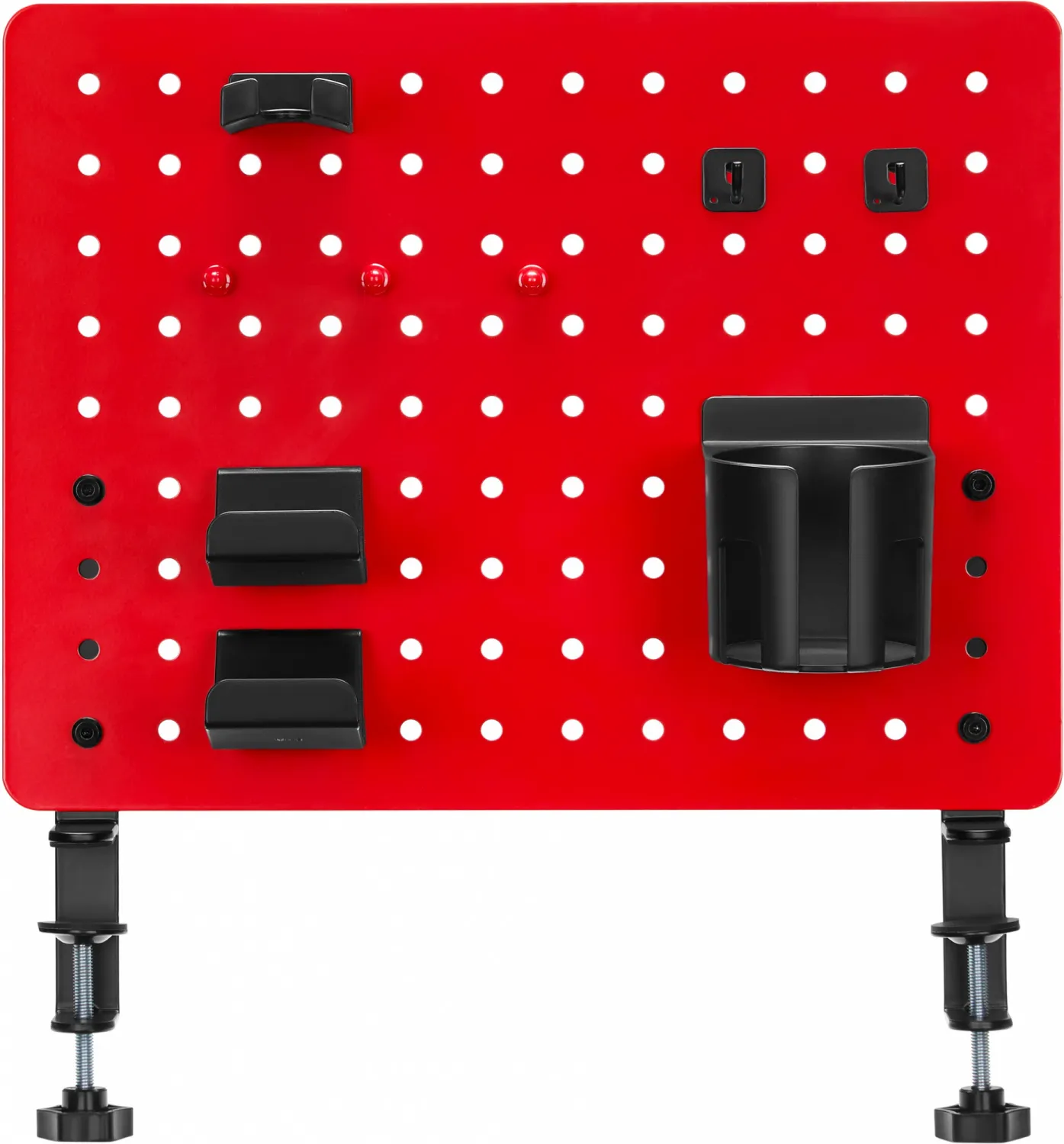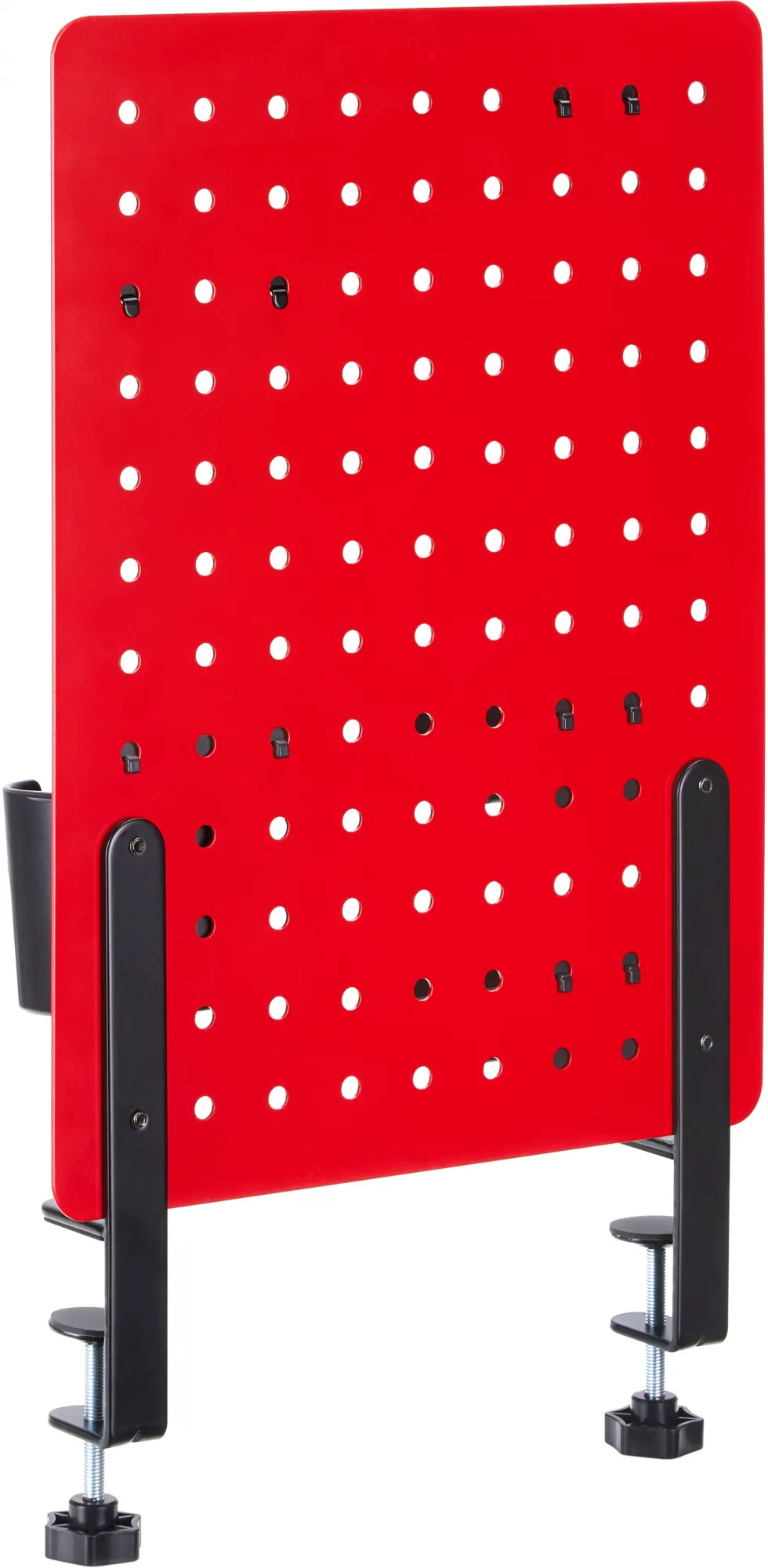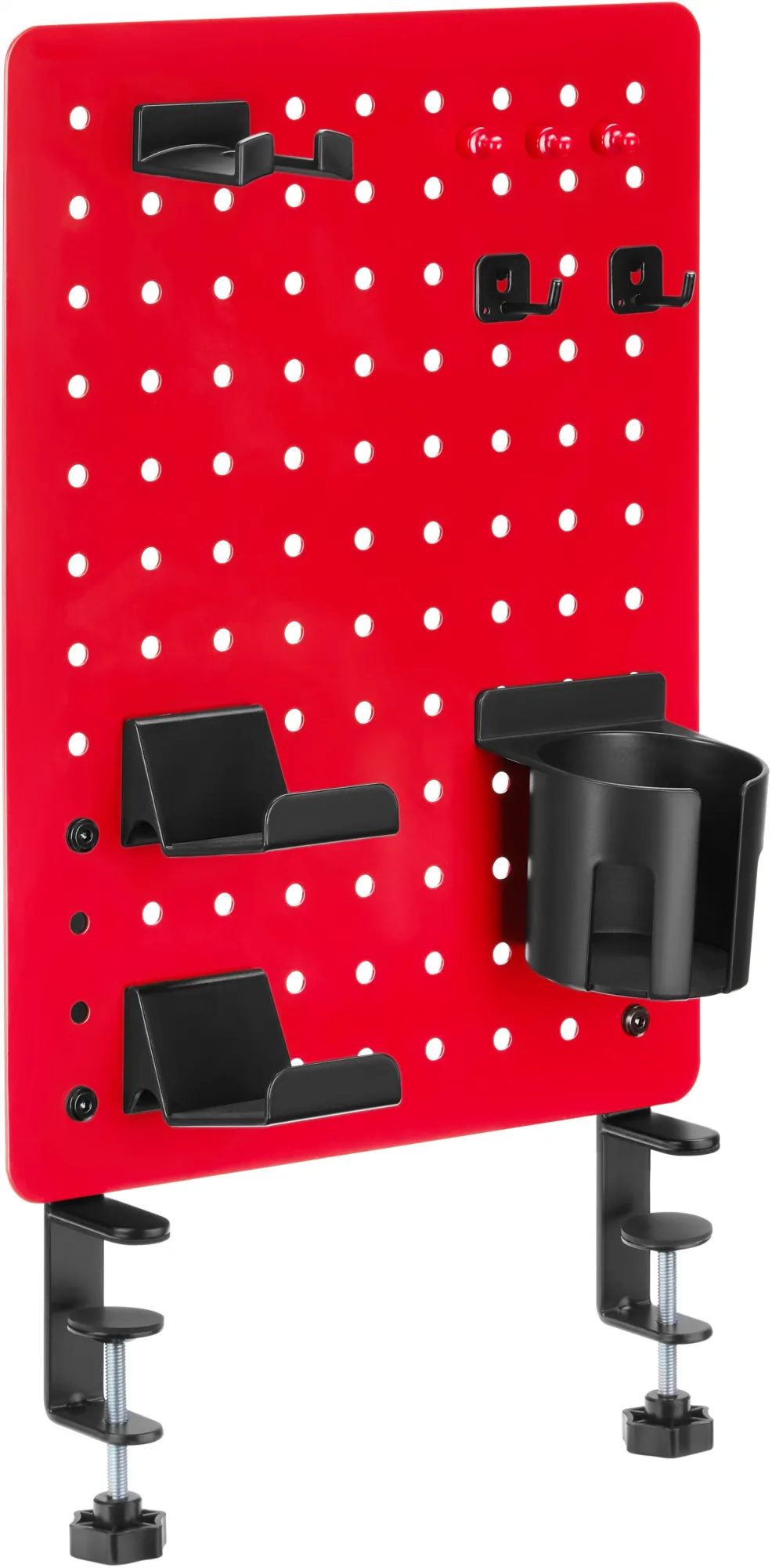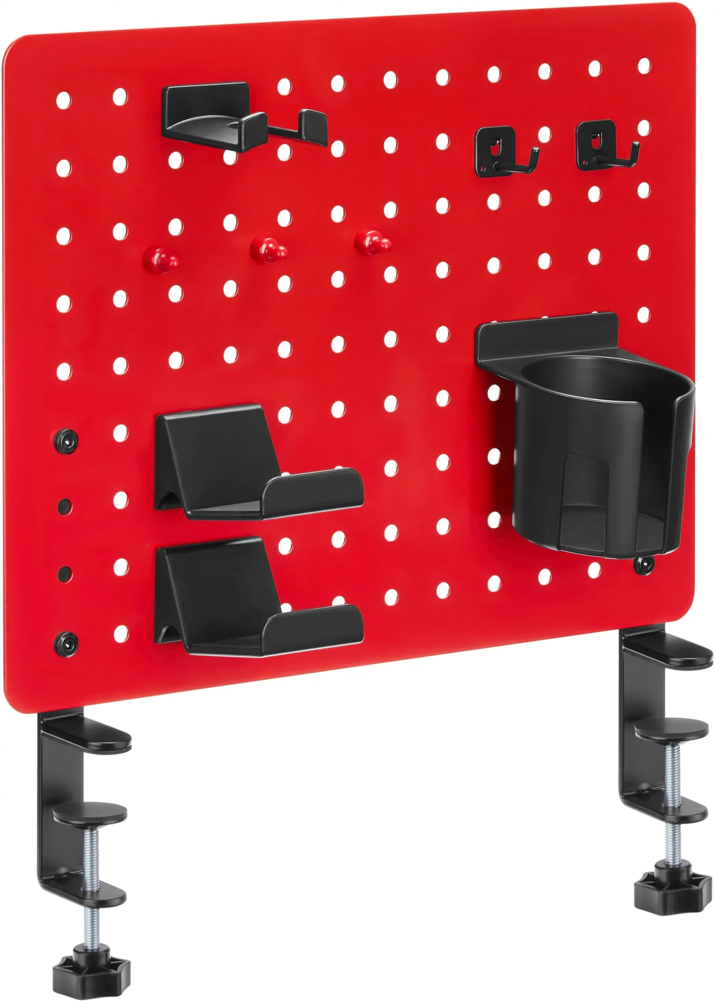 - Настольная перфорированная панель красного цвета с набором аксессуаров для организации рабочего пространства на столе