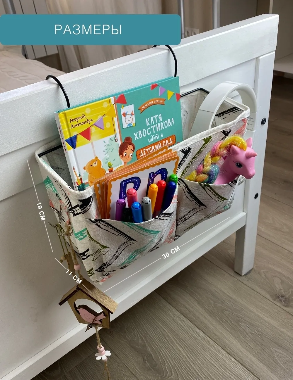 Подвесной органайзер ГЕЛЕОС для кровати, органайзер для детской комнаты – это удобное и практичное решение. Изготовлен из качественного тентового материала Оксфорд. Это качественный и экологичный материал без запаха. Металлическое крепление позволяет повесить органайзер на детскую кроватку, держать детские бутылочки, памперсы, салфетки, разную мелочь. А также для кровати и хранить пульты, журналы, очки, смартфоны, наушники и прочее. Размер 30х11х19 см. Прикроватный органайзер изготовлен из прочной ткани на металлическом каркасе, что делает конструкцию надёжной и удобной в использовании. Каркас крепится на 4 липучки внутри органайзера. Служит как карман на кроватку, органайзер для хранения вещей, органайзер для дома, органайзер для канцелярии, органайзер для косметики. Органайзер с карманами вместительный, его можно подарить на день рождения ребёнка, отличный подарок.