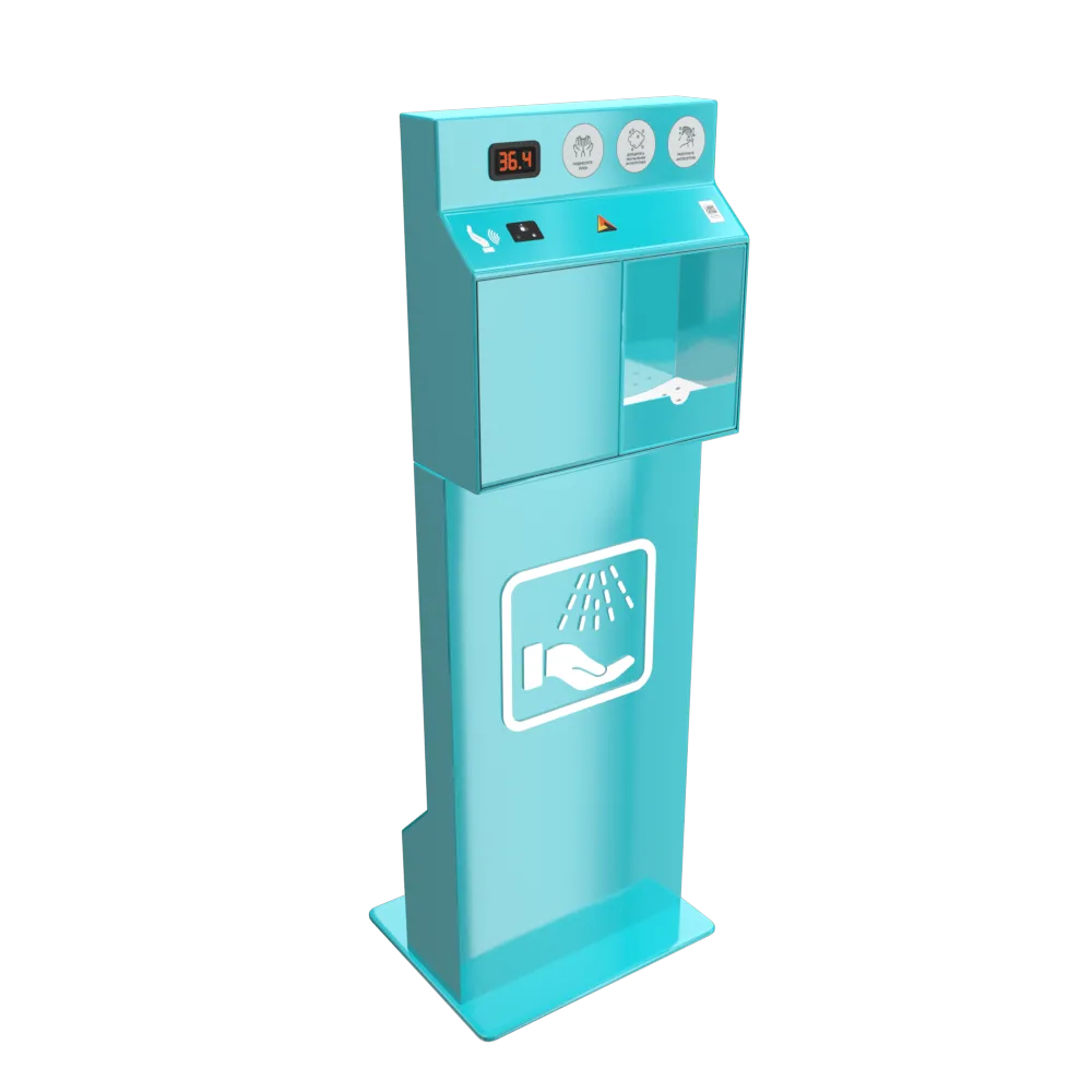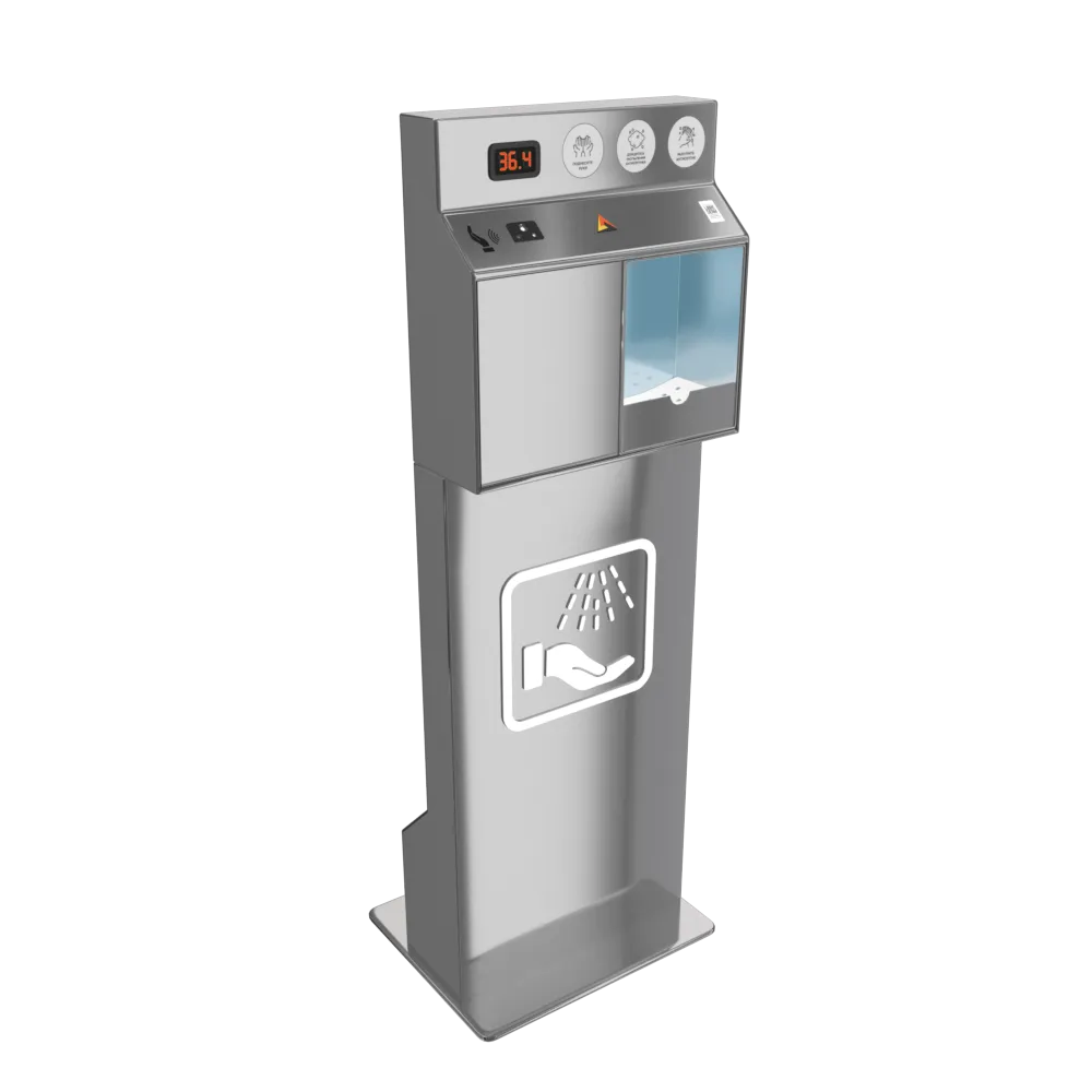 Бесконтактный напольный санитайзер Sanitar. Антивандальный корпус из металла, окрас корпуса по каталогу RAL, - бесконтактный термометр, диспенсер для антисептика, датчик уровня жидкости, Wi-Fi модуль. Объем бака: 3 литра