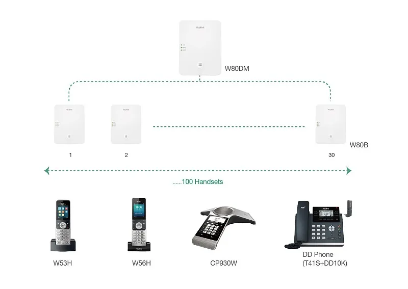 Микросотовая IP-DECT-система Yealink W80 поддерживает подключение к одному DECT-менеджеру Yealink W80DM до 30 базовых станций Yealink W80B. Cистема поддерживает использование до 100 пользовательских устройств, включая DECT-трубки Yealink W59R, Yealink W53H, Yealink W56H, конференц-DECT-телефон Yealink CP930W, а также настольный телефон с поддержкой технологии DECT Yealink W41P. Благодаря поддержке до 100 одновременных вызовов эта система существенно повышает эффективность бизнес-коммуникаций.