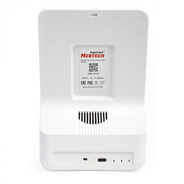 ХарактеристикиУ терминала оплаты СБП Mertech устойчивый корпус из прочного пластика. Сборка является качественной, без зазоров. Надежный корпус выдерживает сильные удары, включая падения с высоты стола на твердый пол. Терминал размером 120×80×170 мм не занимает много места на рабочем столе кассира.