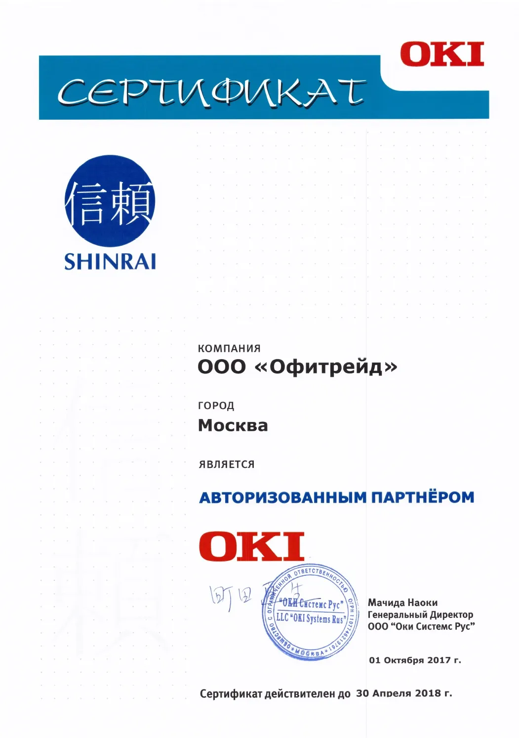 Компания OKI подтвердила статус авторизованного партнера ООО Офитрейд