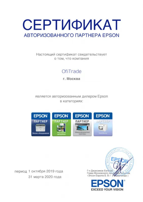 Многолетнее сотрудничество в Ofitrade и Epson продолжается. Продлены авторизация по категориям «Бизнес-оборудование», «Расходные материалы», «Широкоформатные принтеры» и «ColorWorks».